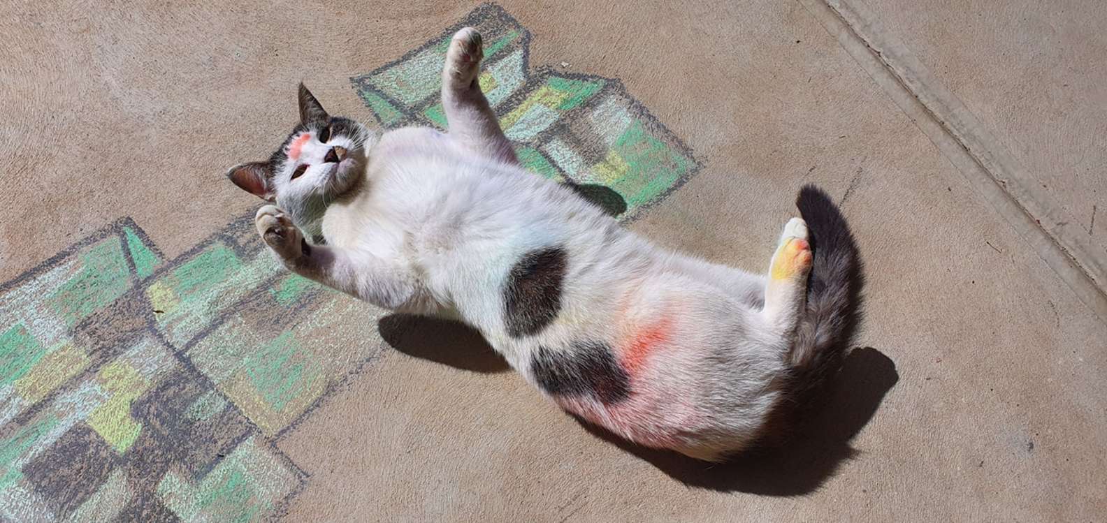 The family’s creations have become smudged as the cats spread around the colors on the ground and onto themselves! But the cats’ happiness simply rubbed off and they couldn’t help but laugh at their new rainbow-colored fur!
