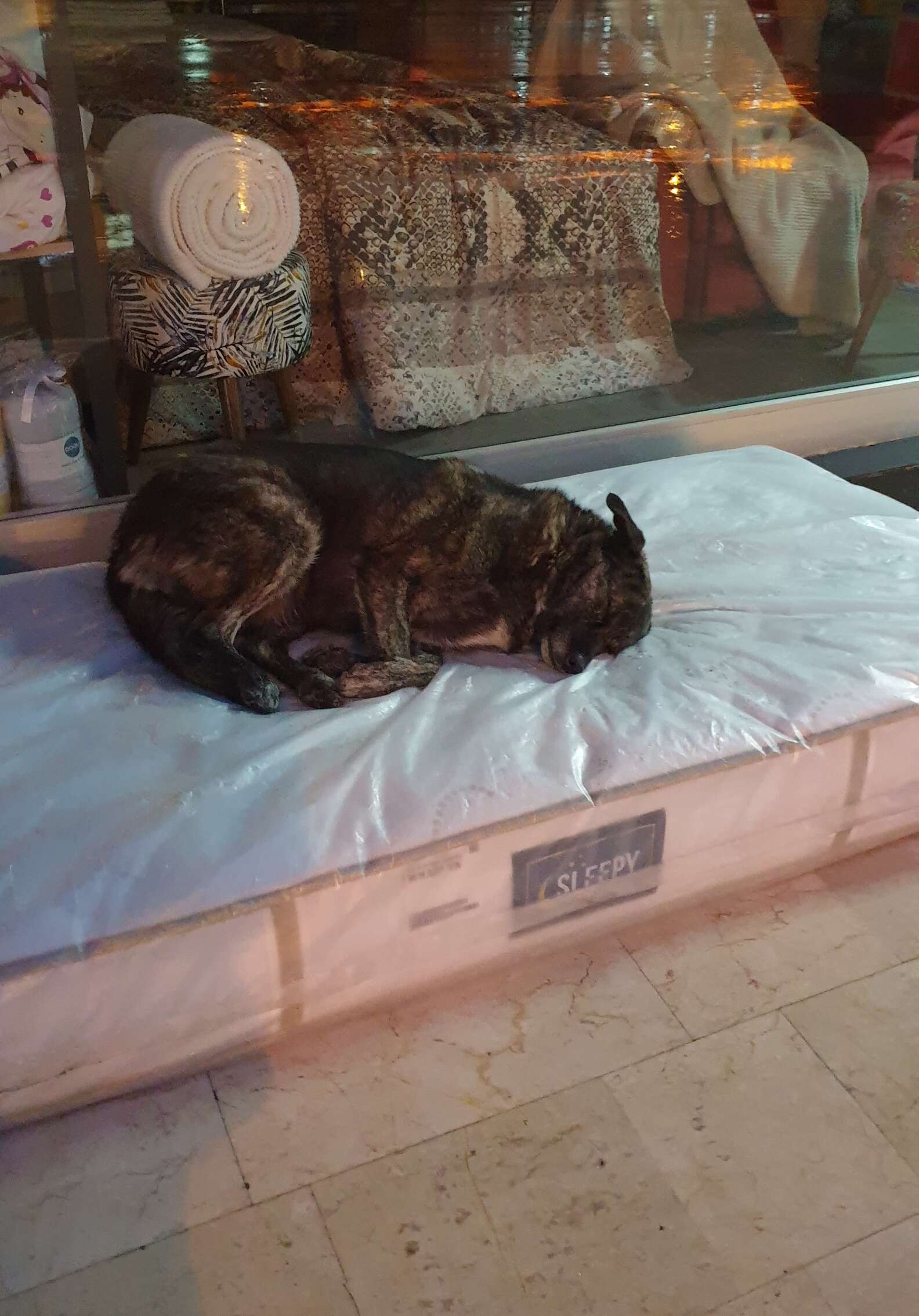 - The shop, which sells beddings and mattresses, has put out a bed in front of their store for the pups to sleep on.
