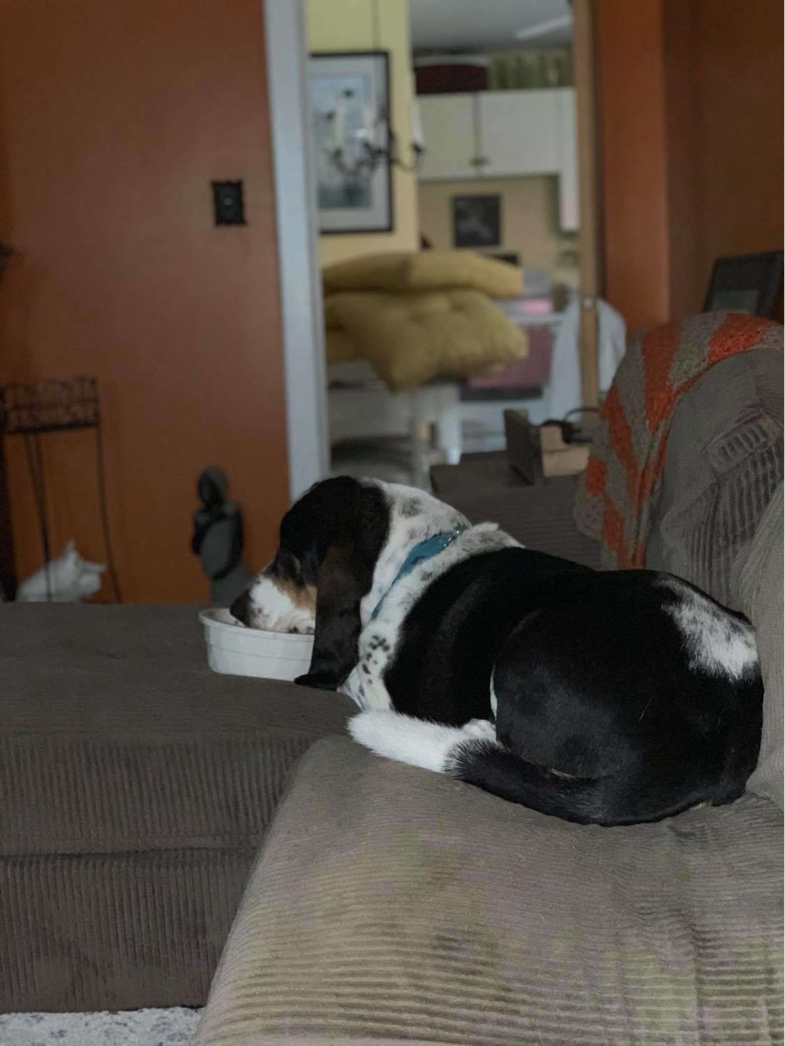 - To avoid future spilling accidents, his mom decided to just put his food bowl on his spot on the couch.