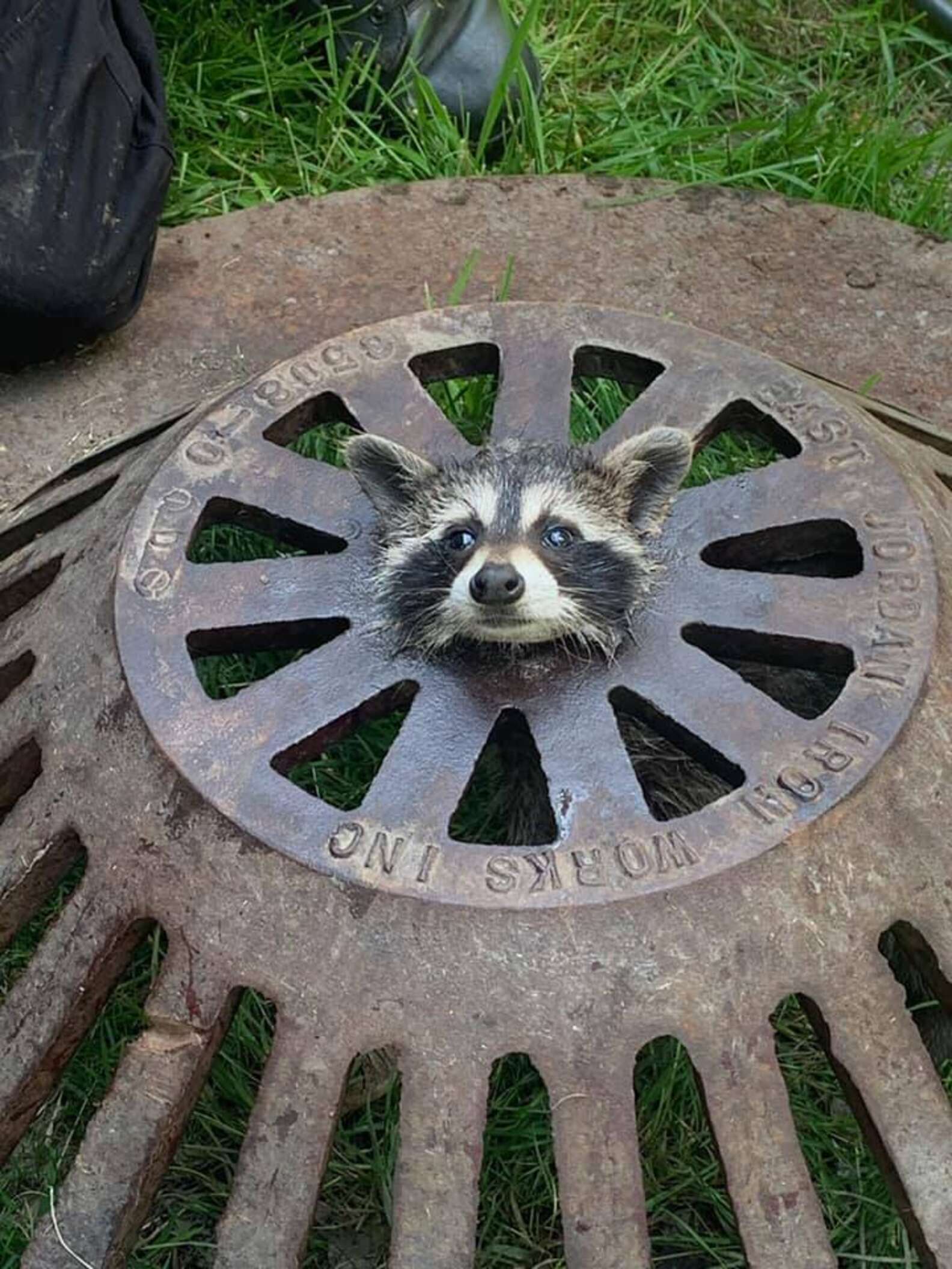 - When animal control arrived at the scene, they realized that a raccoon got his head stuck as he was going out of a sewer grate.