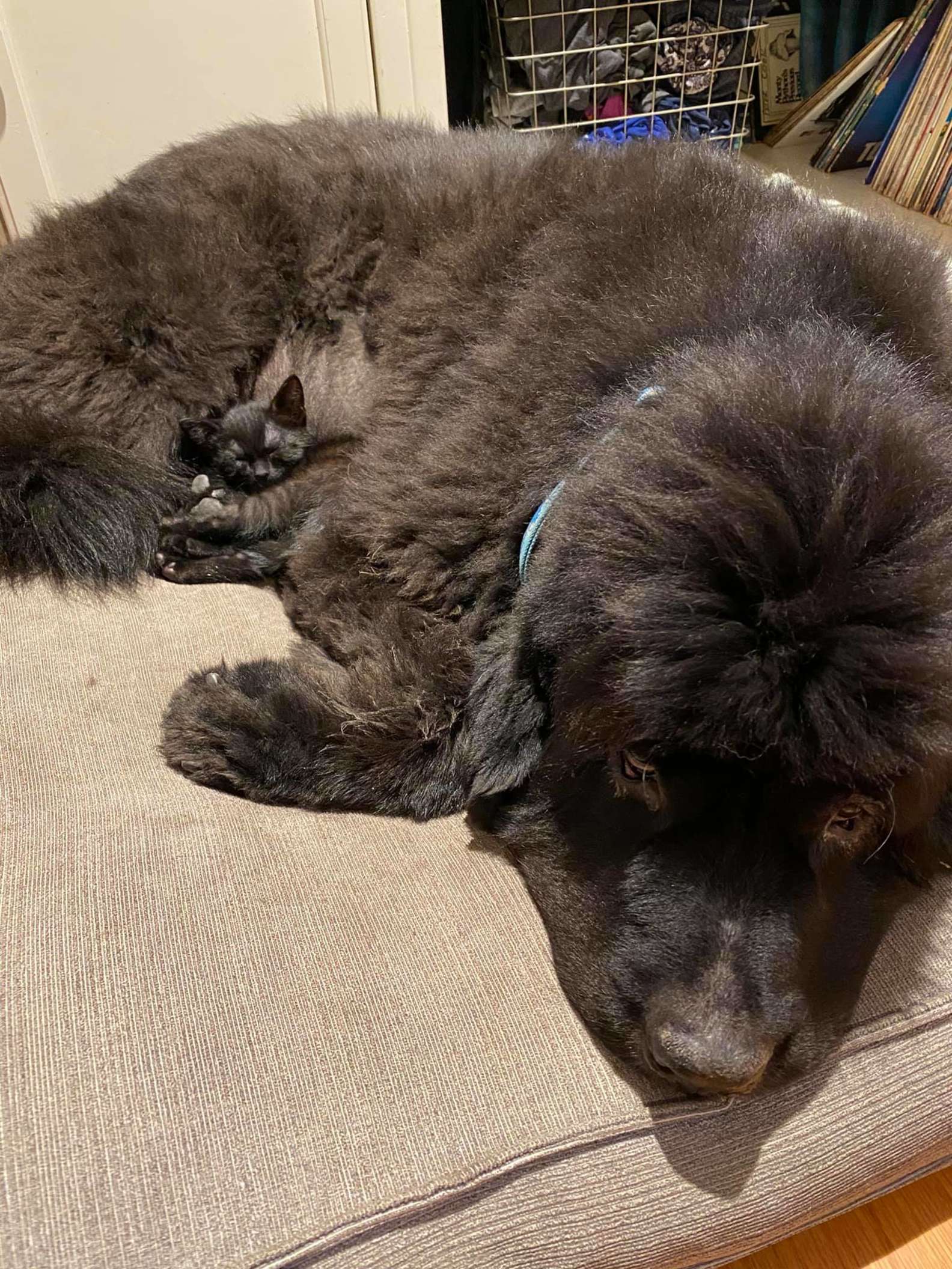 “He walked right up, touched Angus’ face with his paw, and jumped around on his dog bed,” Alexandra said. “After a few minutes of playing, he snuggled right up to Angus and that’s been his pattern ever since. He was immediately sure that snuggling against Angus’ side was a safe place for him and never seemed to have any doubt.”