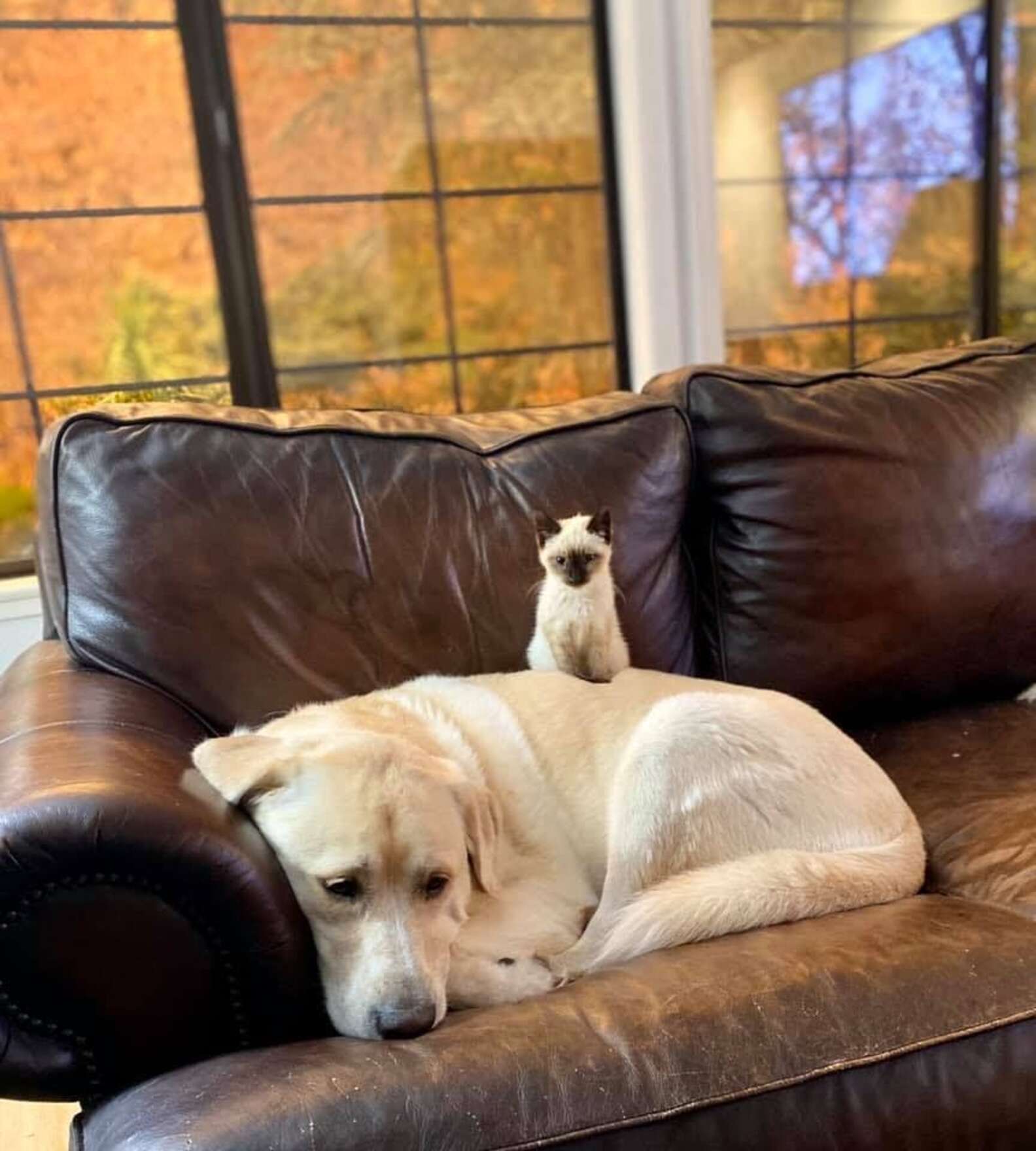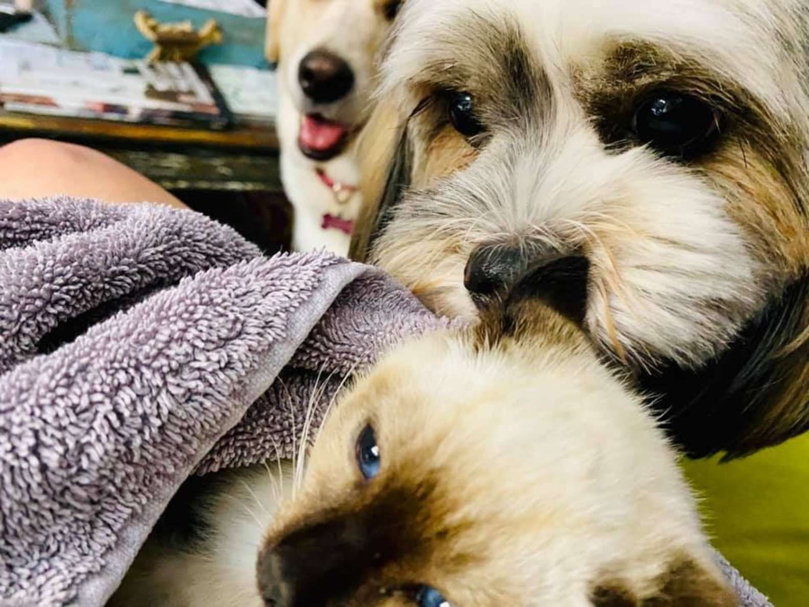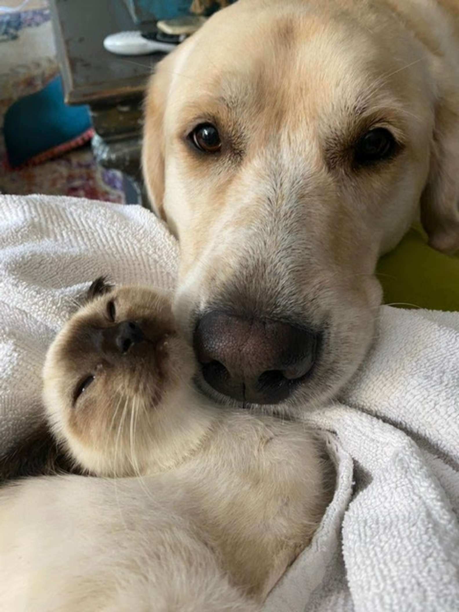 - With the help of the loving dog who stayed beside her, the kitten’s sweet personality shone through in just two weeks.
