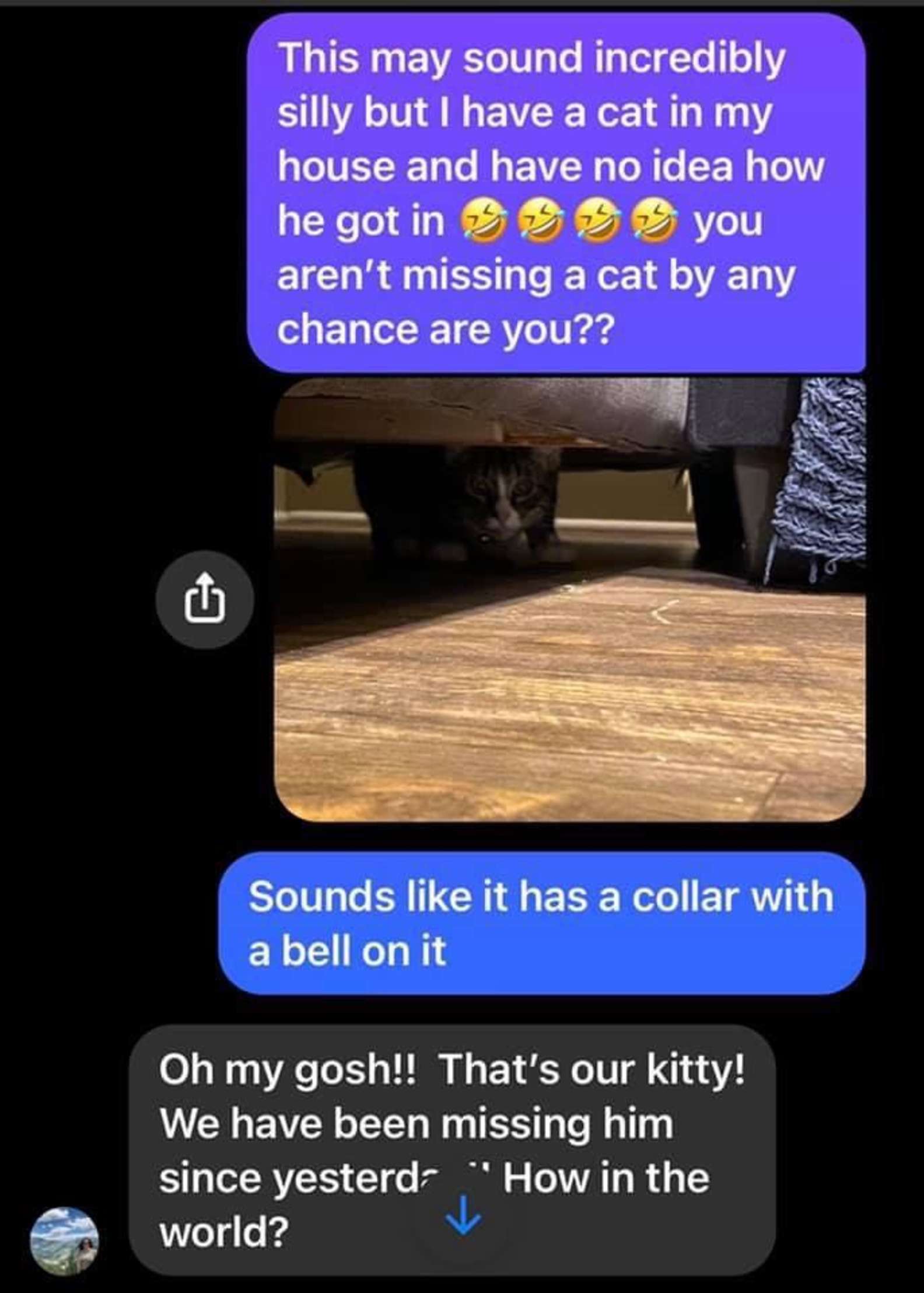 So, she contacted the previous owners of the couch to ask if the cat belonged to them.